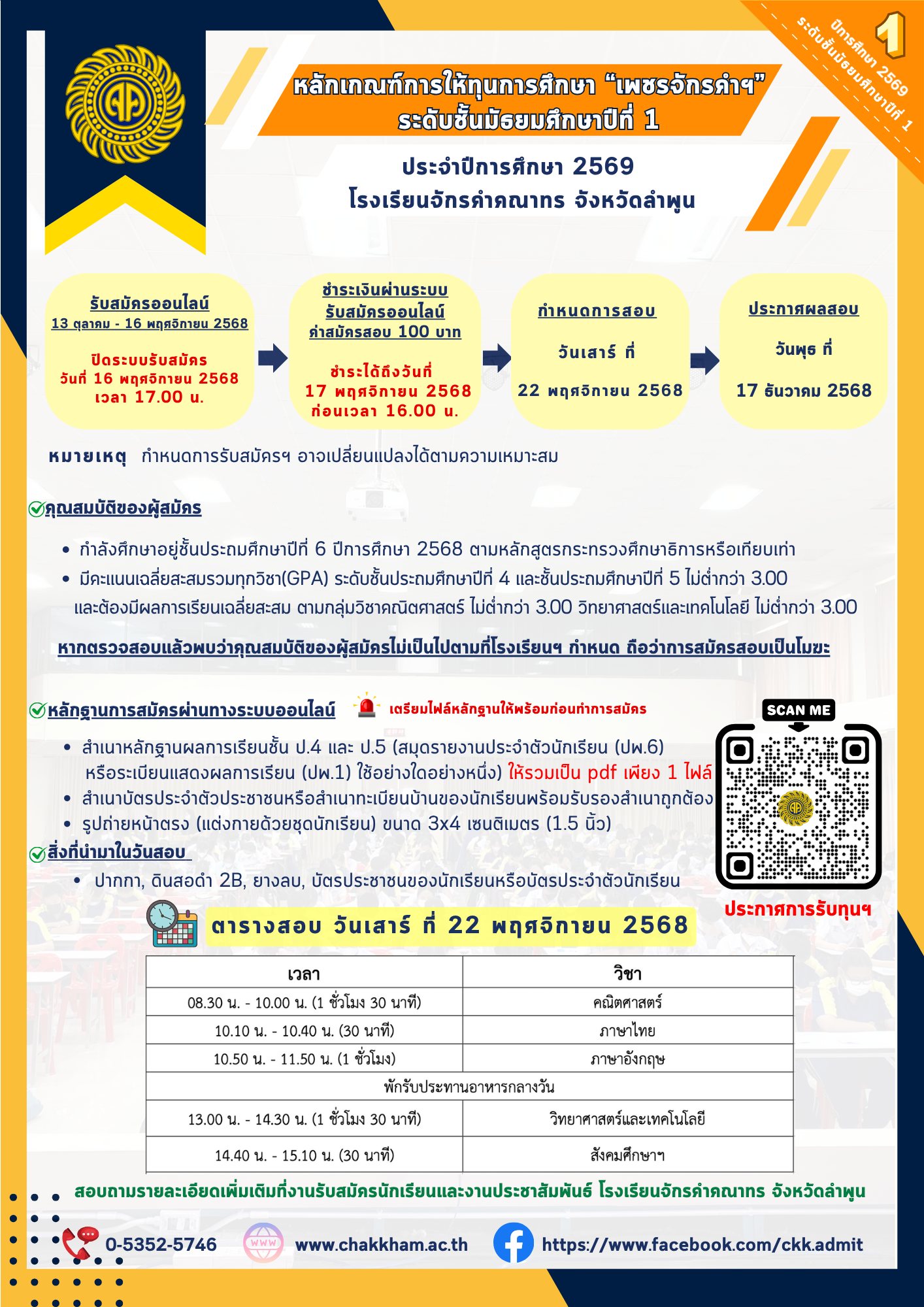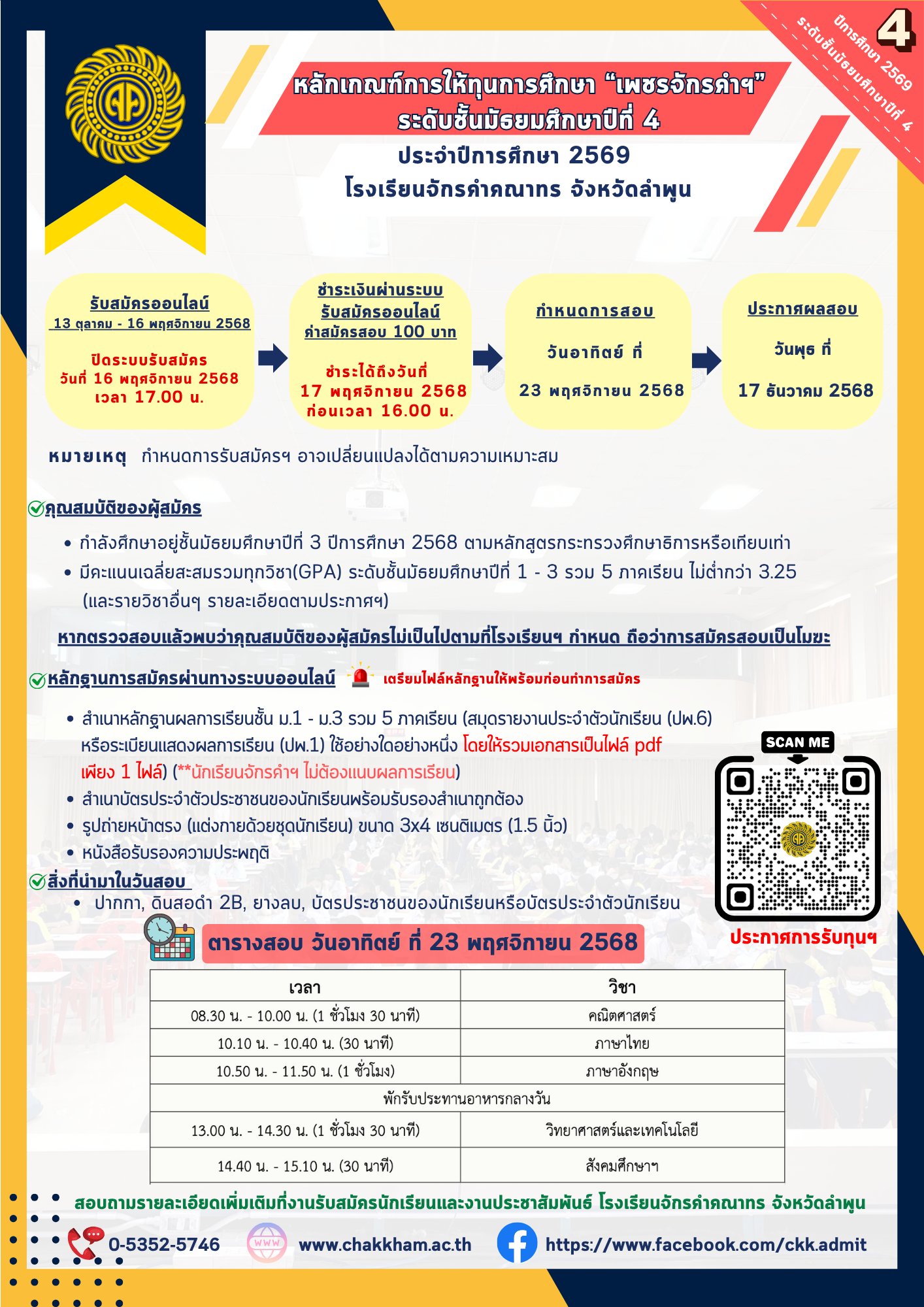 ประกาศผลสอบทุนการศึกษาเพชรจักรคำฯ ประจำปีการศึกษา 2569